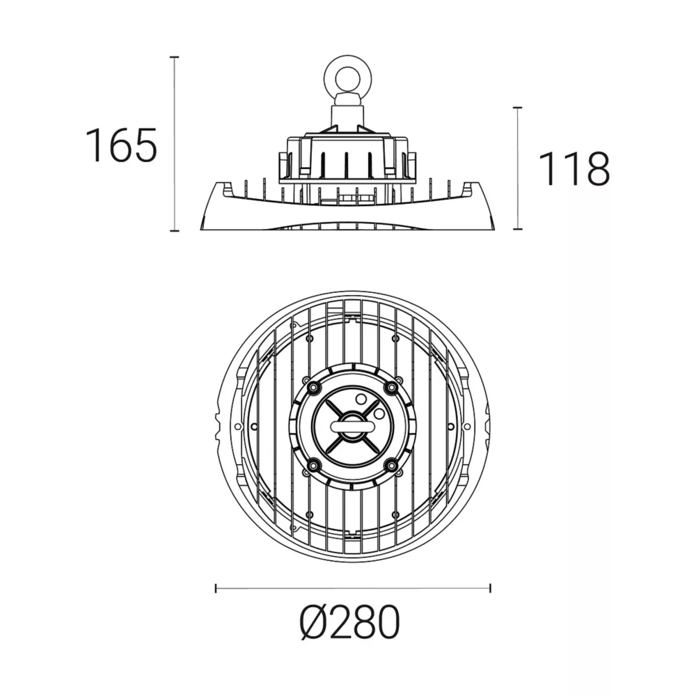 Robust and low-profile with die-cast, powder-coated body. Heat sink offers excellent thermal performance. Pre-wired with 1m of H05RN-F cable for ease and speed of installation. Suitable for drop rod, jack chain and catenary wire fixings. Ingress protection rating of IP65 offers range of installations, including factories and warehouses.