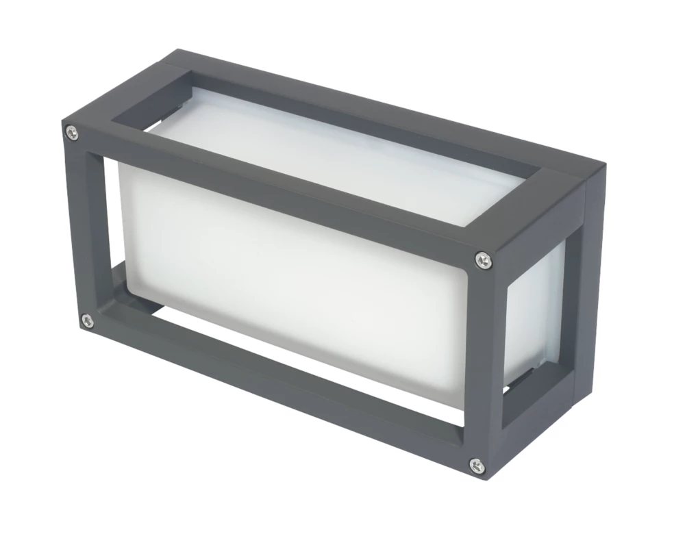 Architectural low level surface brick light / wall light with graphite textured powder coat paint finish and toughened frosted glass with die-cast aluminium housing.