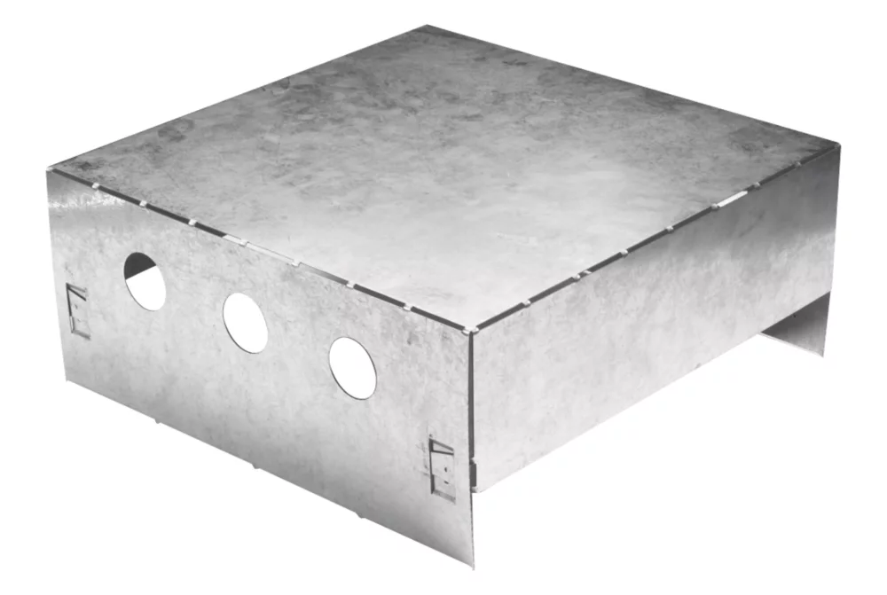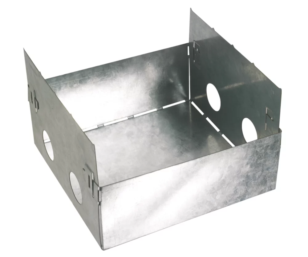Steel. Protects downlights from being covered with insulation and prevents overheating. Suitable for installation between common joist spacing.