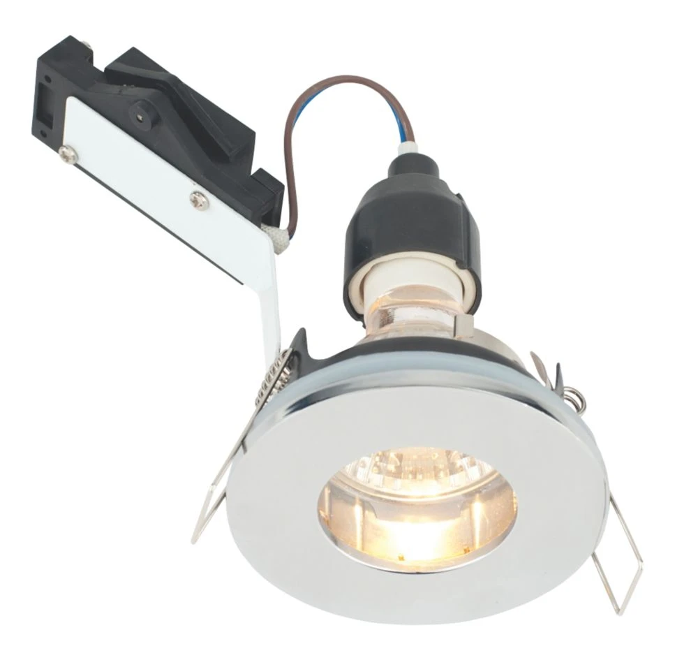 A fixed, polished chrome effect downlight. Mains voltage bathroom light.