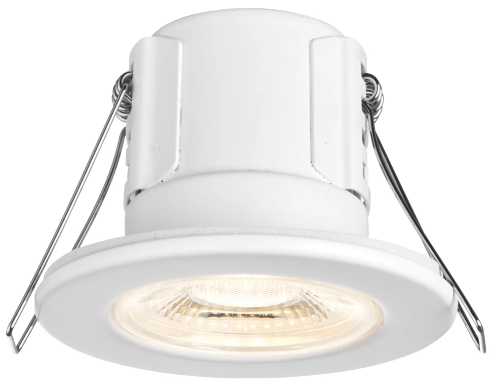 30, 60 and 90min fire rated LED downlight. Steel and acrylic construction. Supplied with 3 different coloured bezels and fitted with CCT technology, enabling choice between warm and cool white. Tool-free instalation.