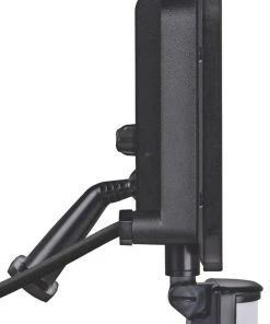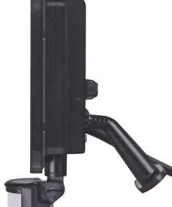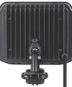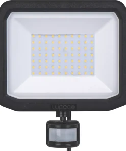 Aluminium and glass construction. Floodlight with swivel and tilt mounting arm and adjustable PIR. Pre-wired with a 1m rubber cable. Adjustable time and lux PIR with override function.