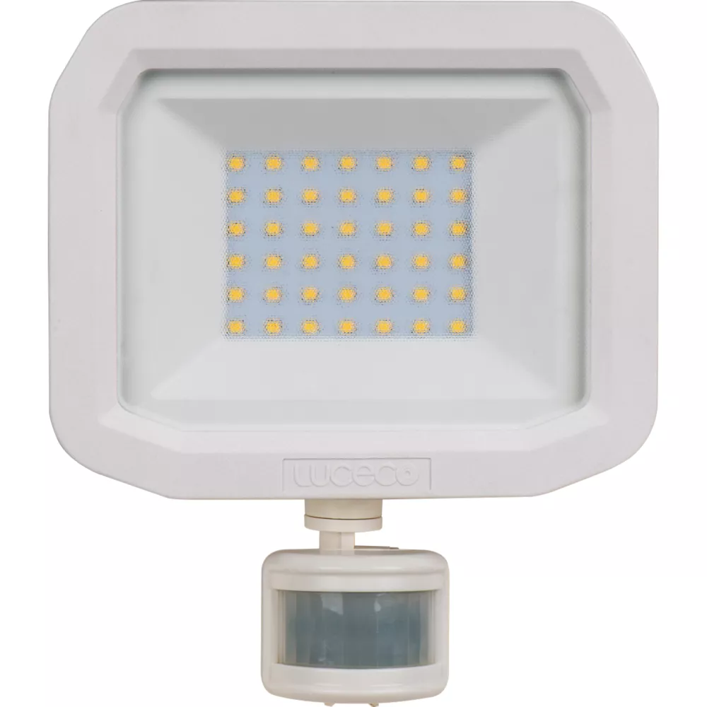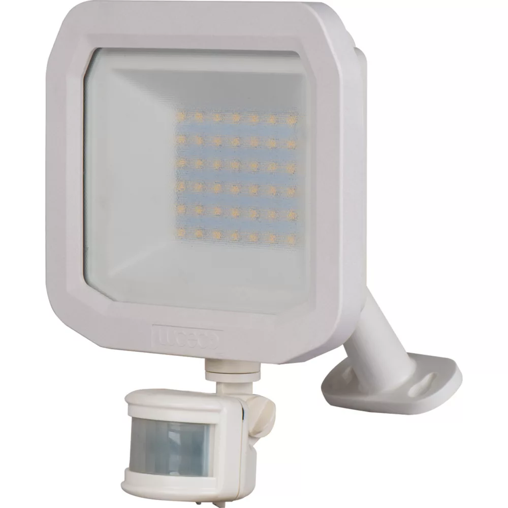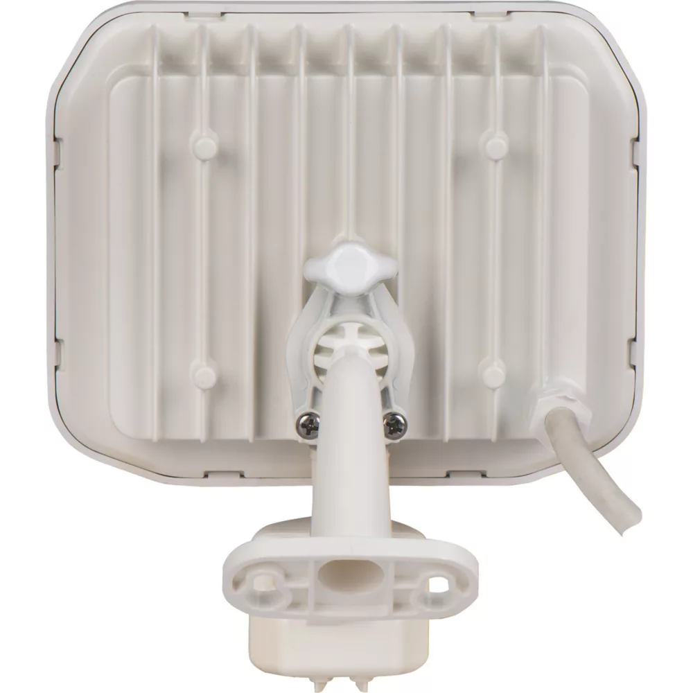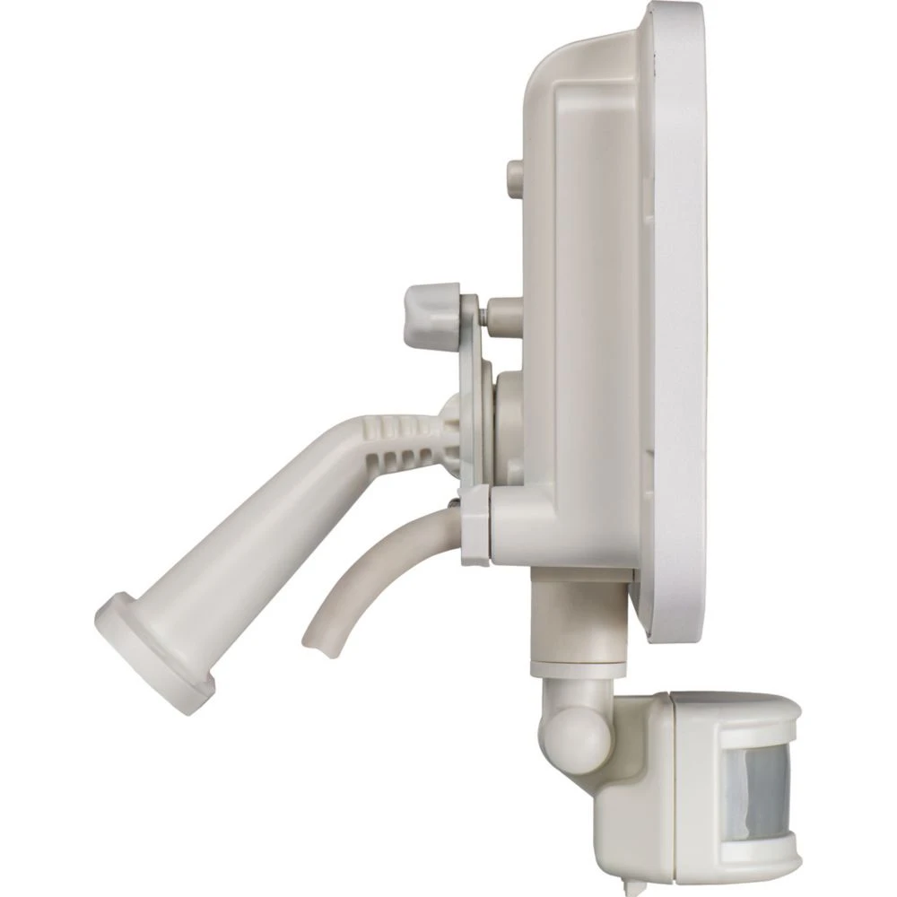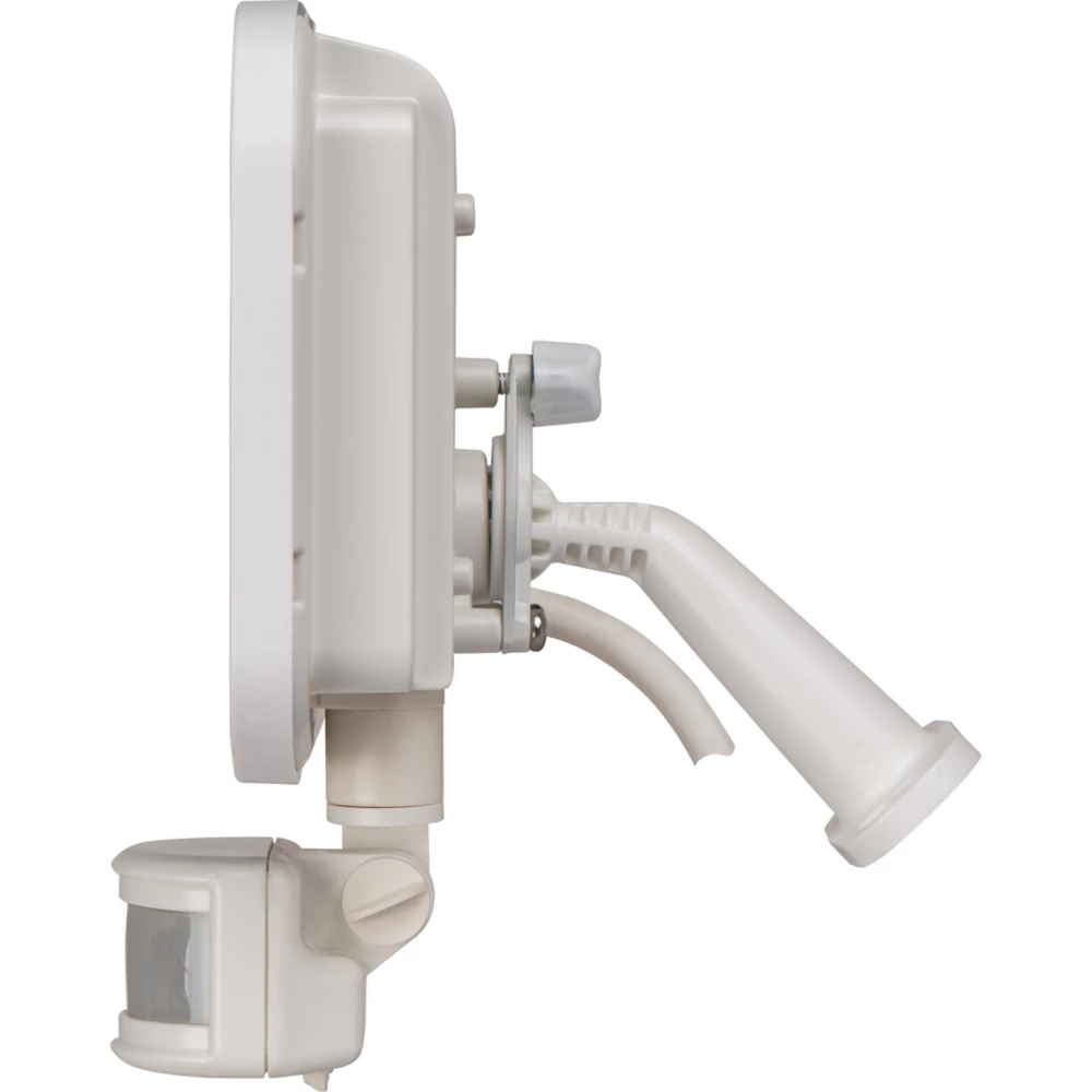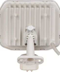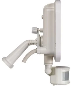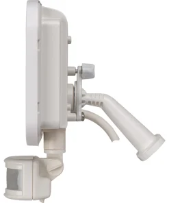 Aluminium and glass construction. Floodlight with swivel and tilt mounting arm with adjustable PIR. Pre-wired with a 1m rubber cable. Adjustable time and lux PIR with override function.