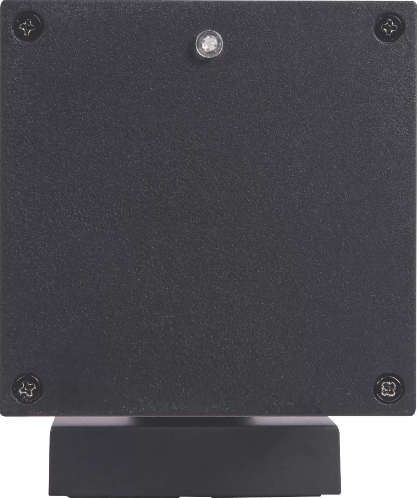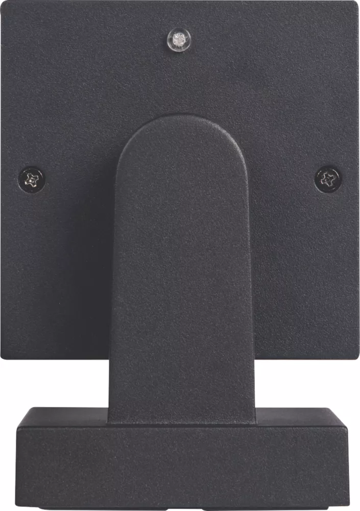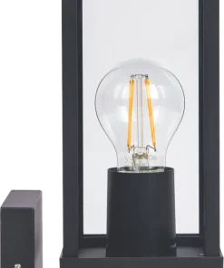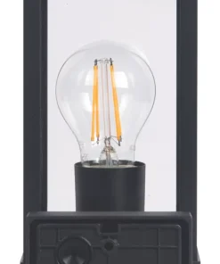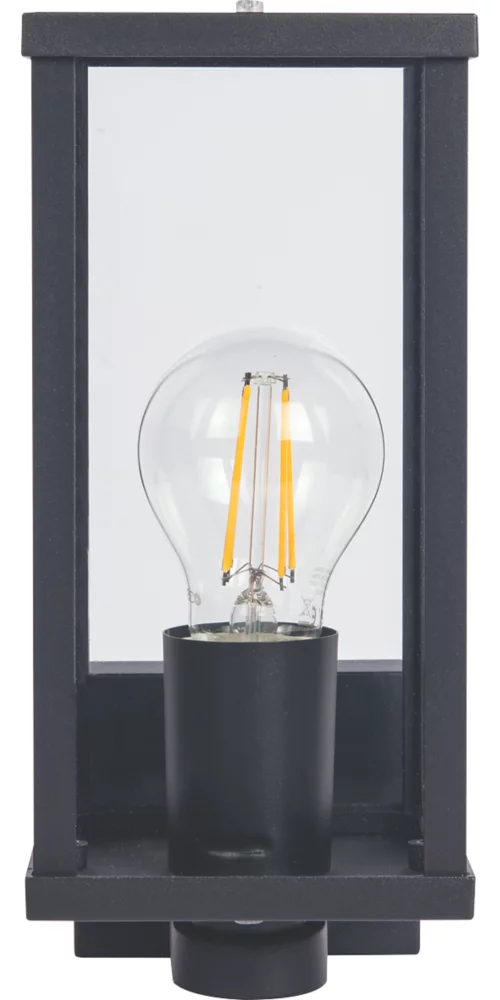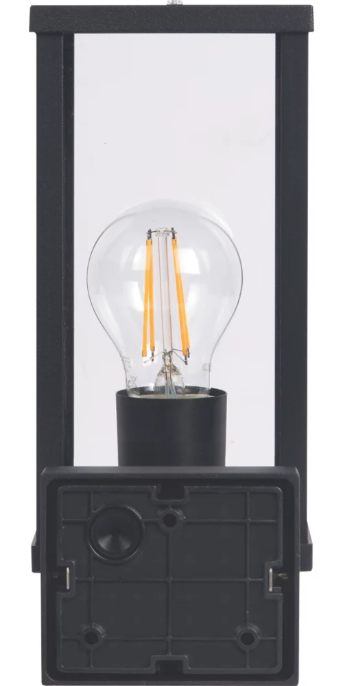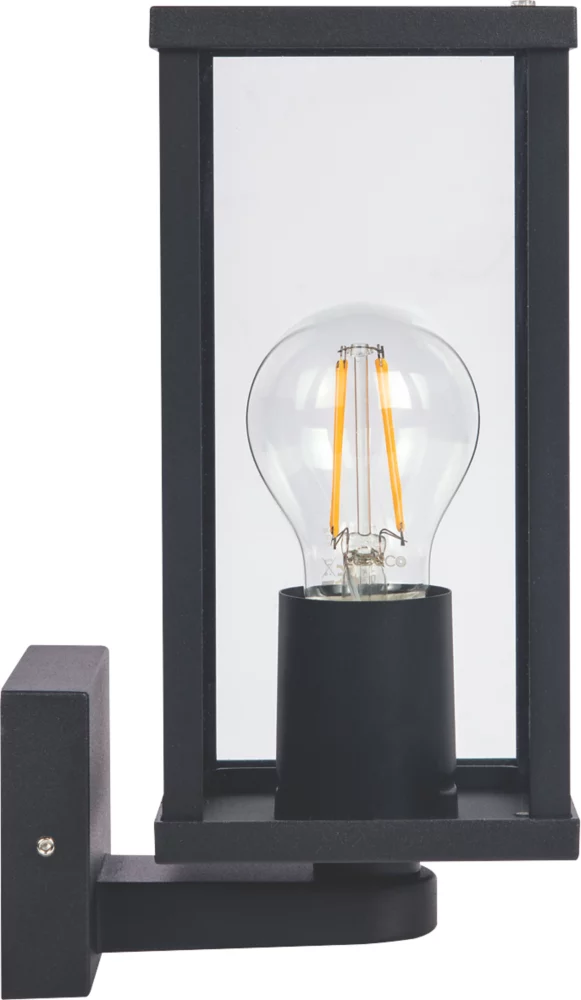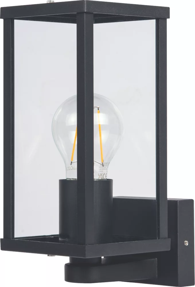 Modern top / bottom arm wall lantern in black with glass panels. Single E27 lampholder, ideal for LED filament lamps.