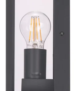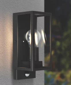 Modern, flush-mounted PIR wall lantern with glass panels and single E27 lampholder. Ideal for LED filament bulbs.