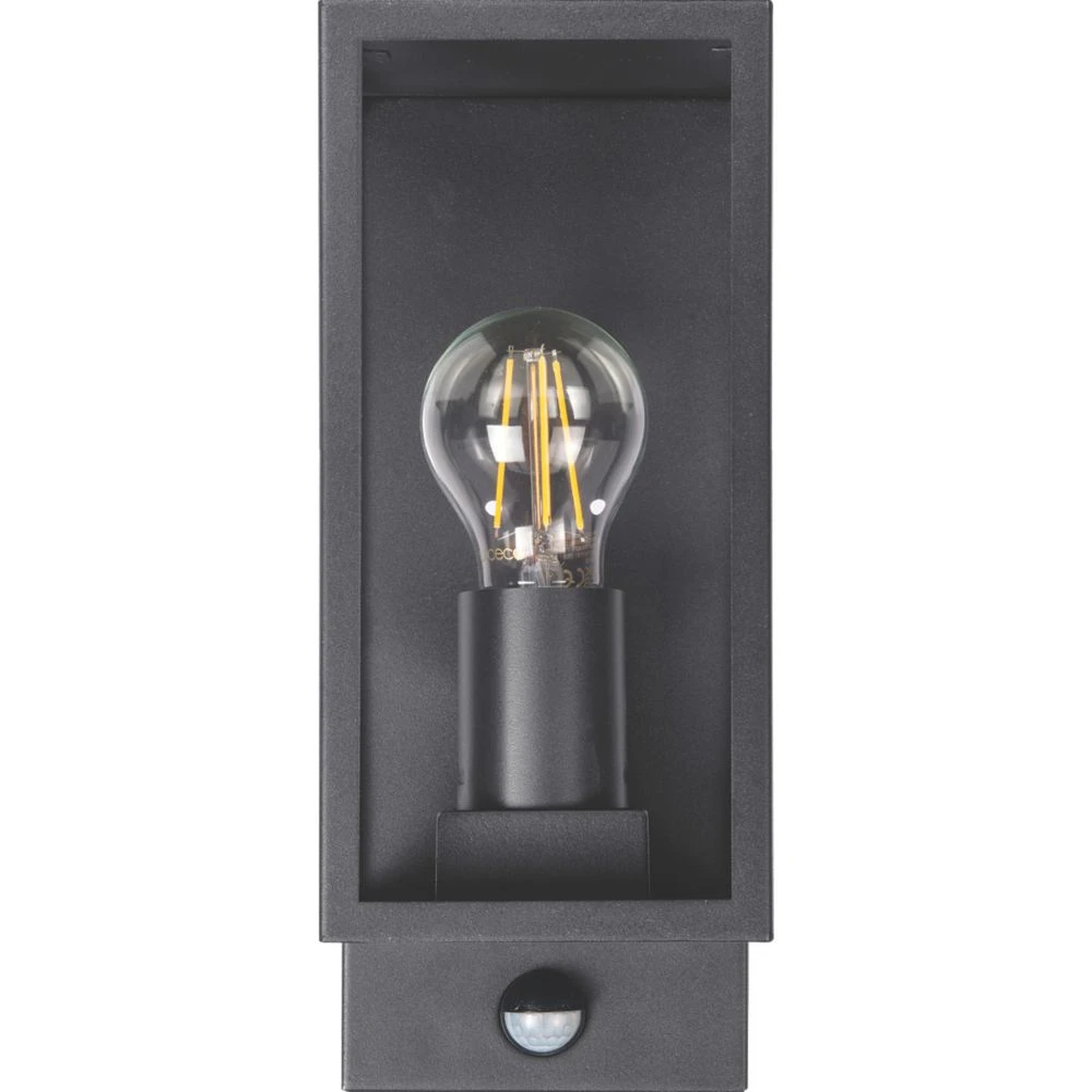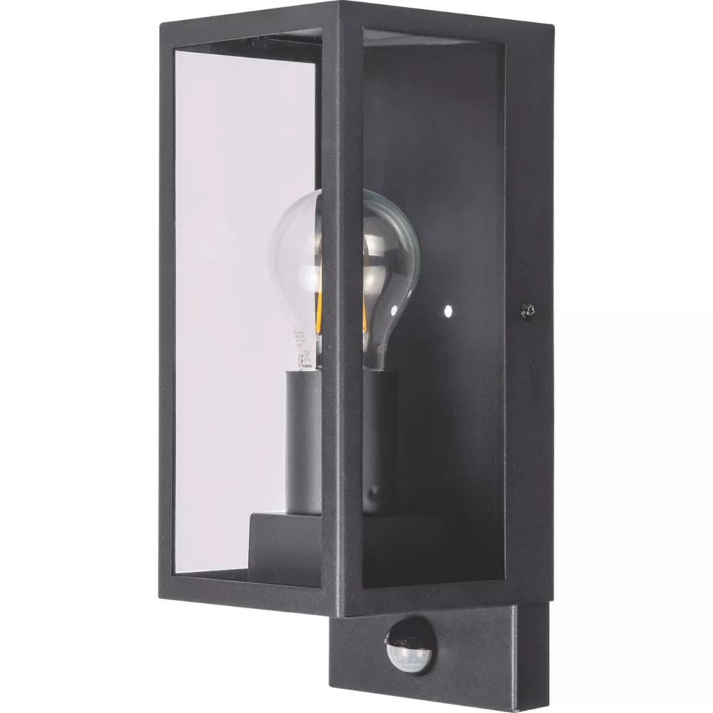 Modern, flush-mounted PIR wall lantern with glass panels and single E27 lampholder. Ideal for LED filament bulbs.