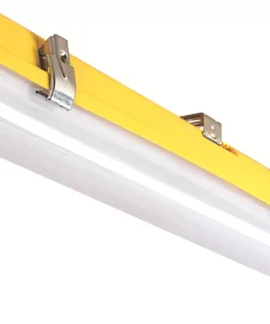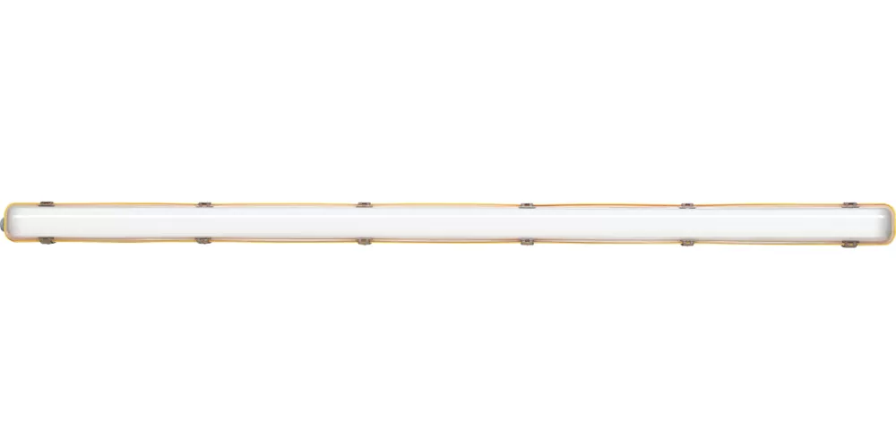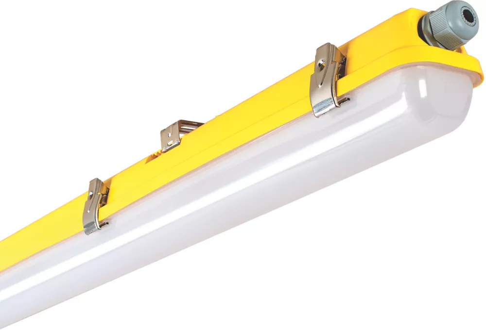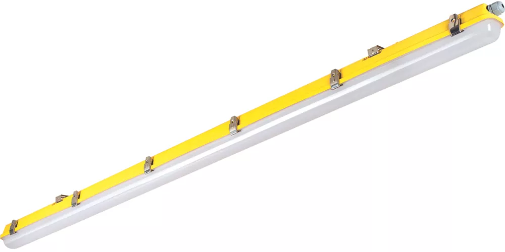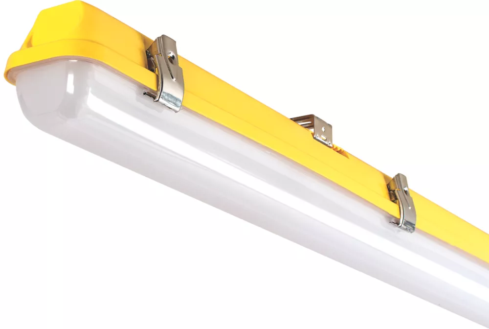 Robust, 110V polycarbonate weatherproof linear luminaire for use internally or externally. Speed-fit installation type with no need to remove geartray, minimising potential damage. Also features emergency back-up.