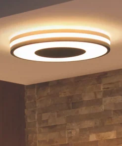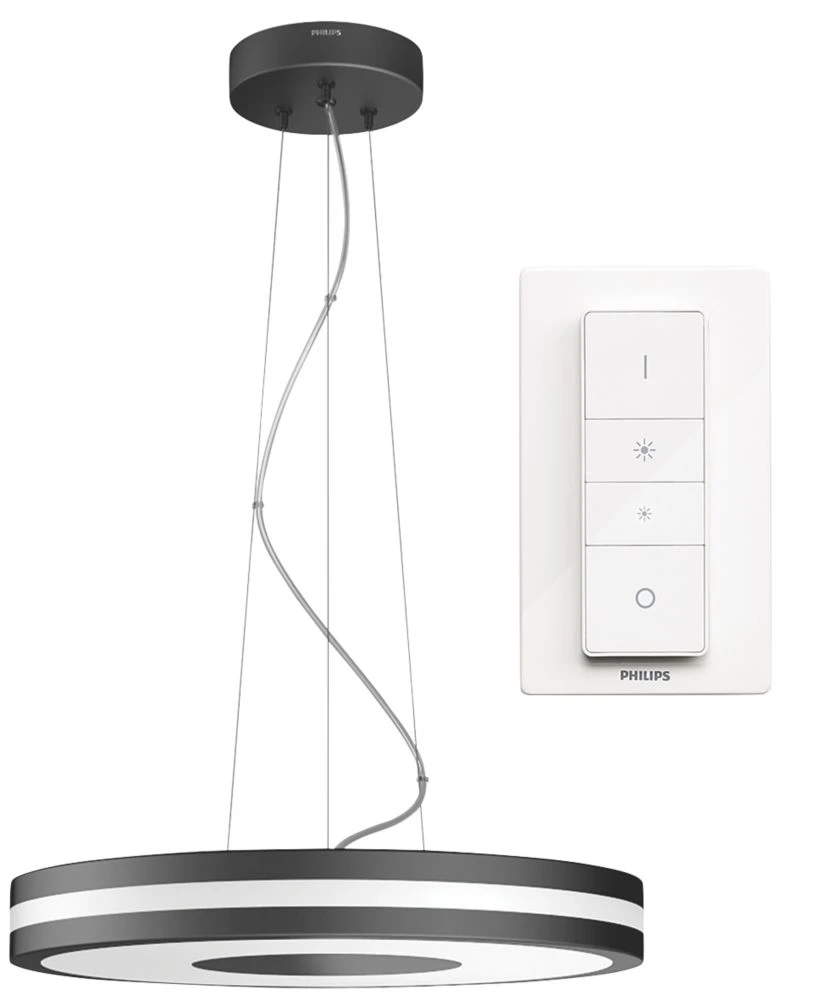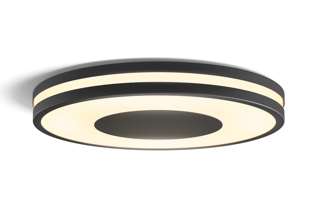 Thin circles of aluminium cast warm-to-cool white light in 3 directions. Offers instant control via Hue dimmer switch (included) or Bluetooth. Hands-free voice control can also be set up. Add a Hue Bridge (sold separately) for additional features.