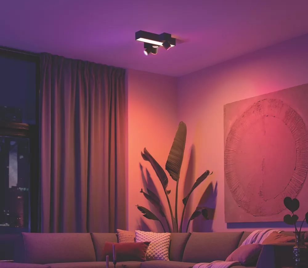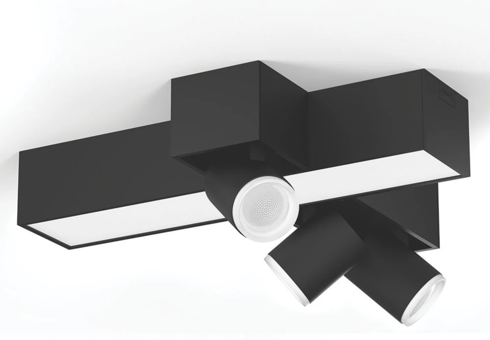 Contemporary, fixed ceiling light with aluminium body, thermoplastic diffuser and 3 spotlights that can be angled individually. Set each light in the fixture to your preferred colour choice from an extensive range available. Control via the Philips Hue app.