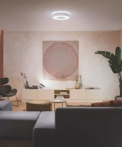 Fills the space with powerful light while casting a subtle glow onto the ceiling. Colour settings can be changed using the Philips Hue app. Compatible with Hue Bridge (sold separately).