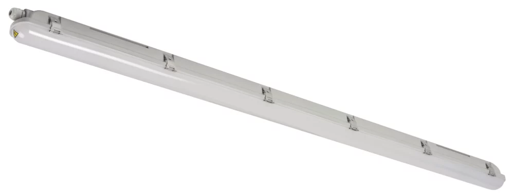 Robust and waterproof luminaire that can be deployed in a wide variety of locations. Supplied with ceiling-mounted brackets and suspension hooks.