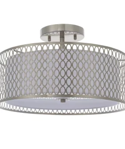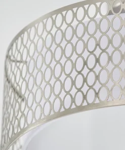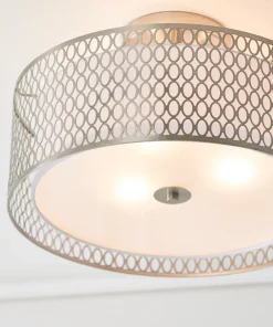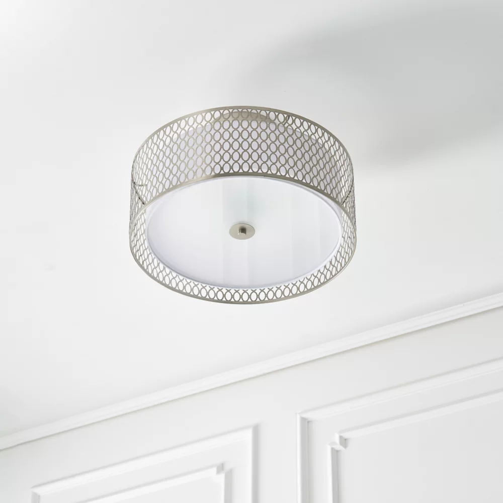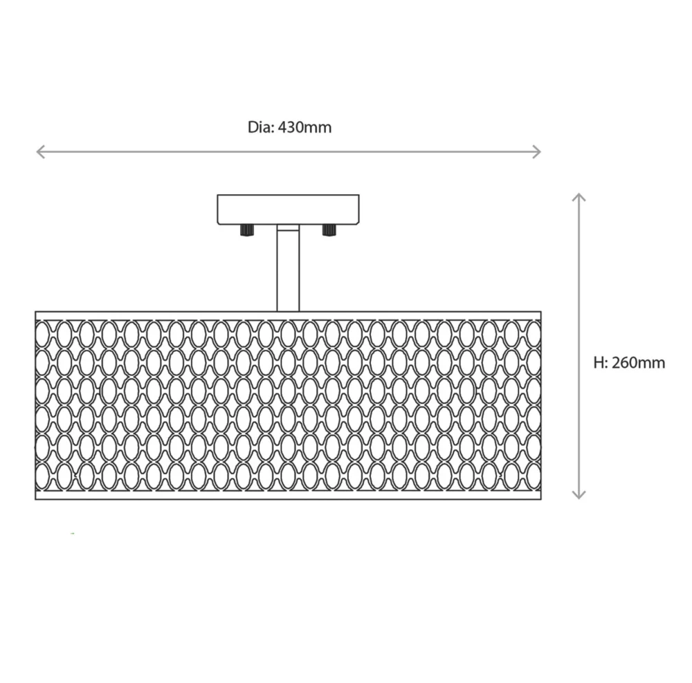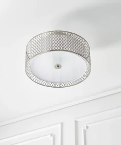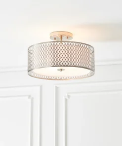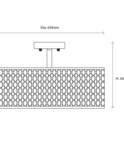 Geometric fretwork metal outer. Inner shade made from fabric and frosted glass for diffused light effect. Ideal for low ceilings.