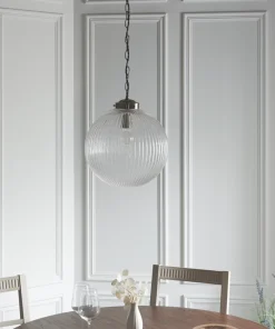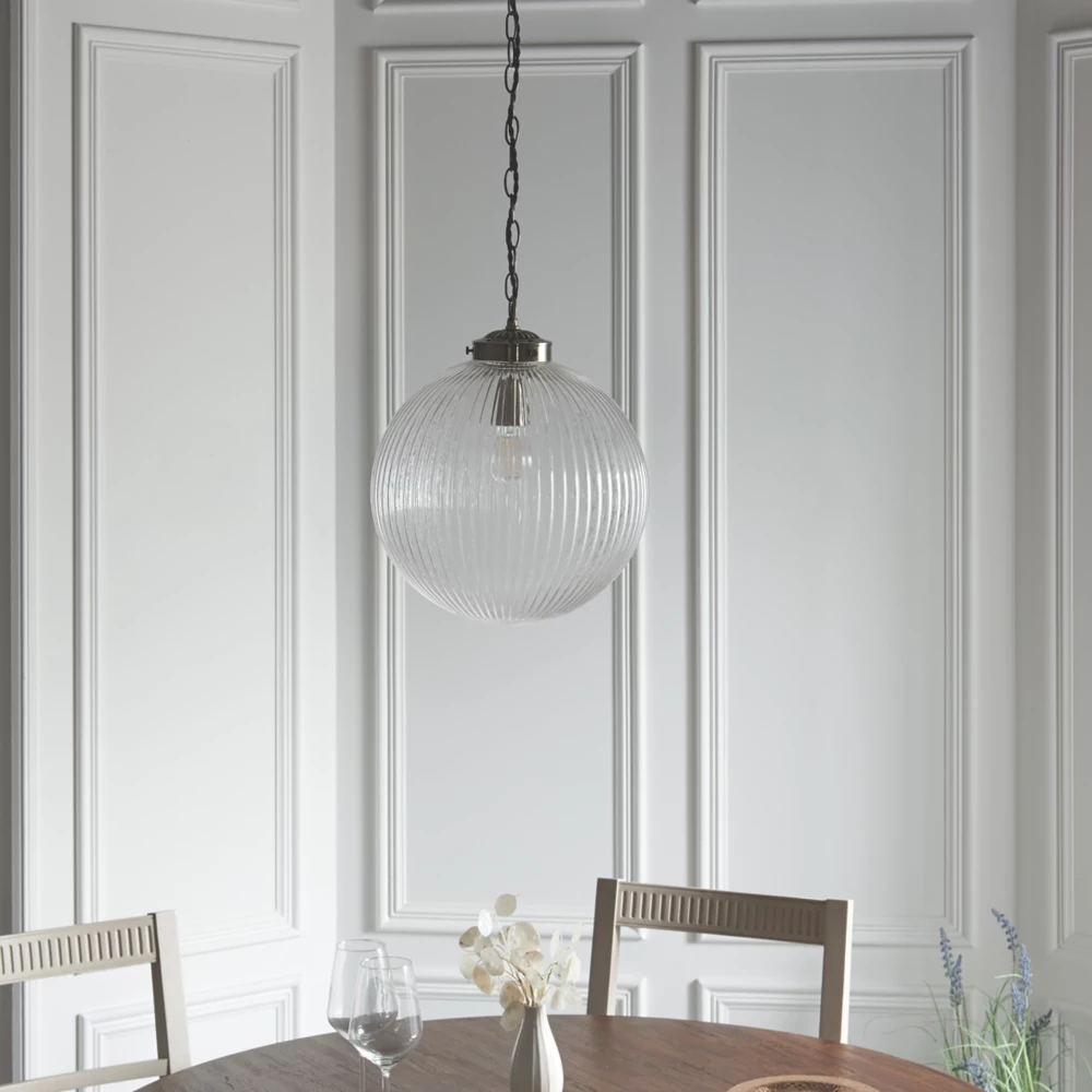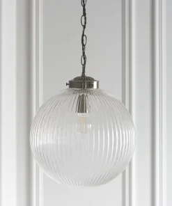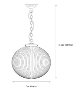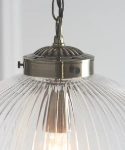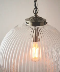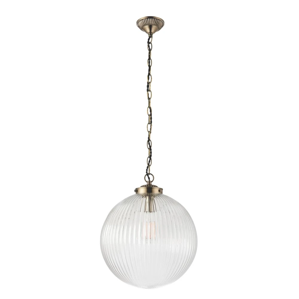 Round glass shade with ribbed design, suspended from decorative chain in antique brass finish.