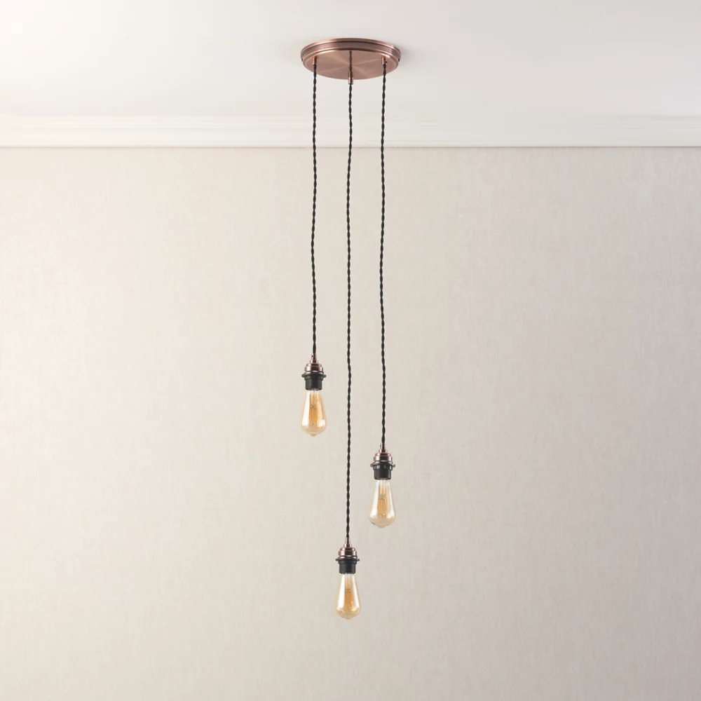 Versatile 3-light cable set pendant suited to a range of interior designs. Can be accessorised with glass or fabric shades.