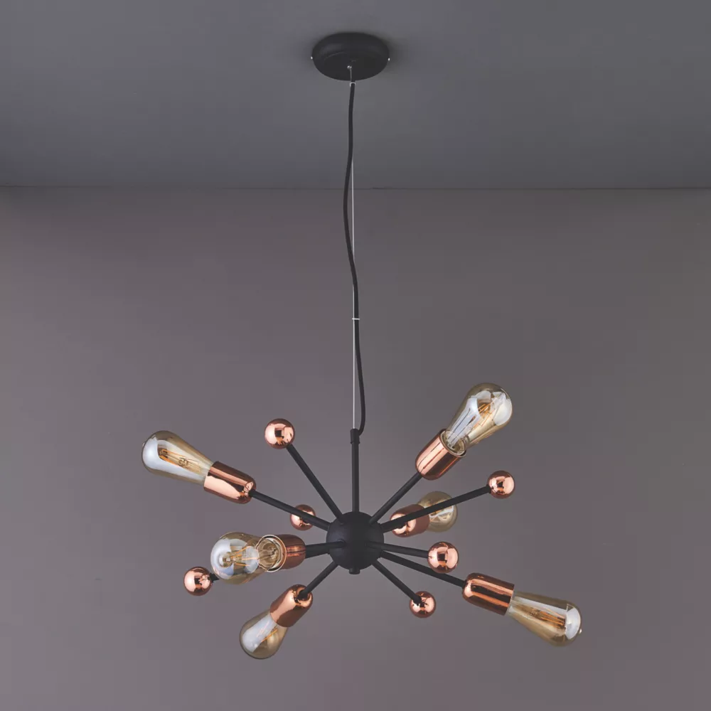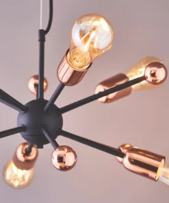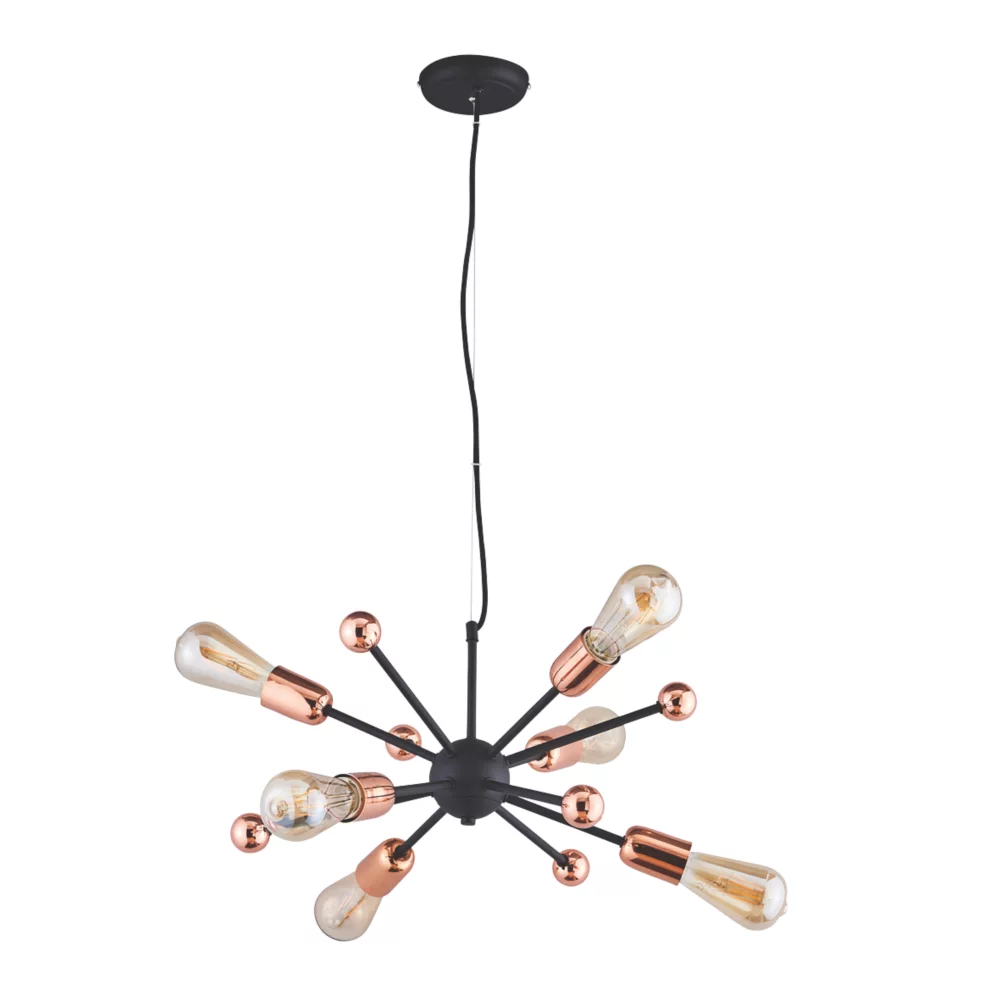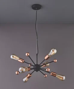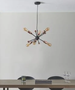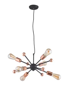 Industrial style. Adjustable multi-arm pendant with six lights, suspended from a matt black plate.