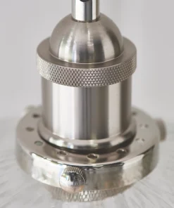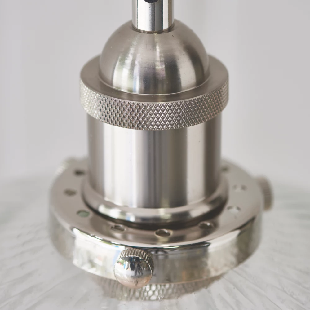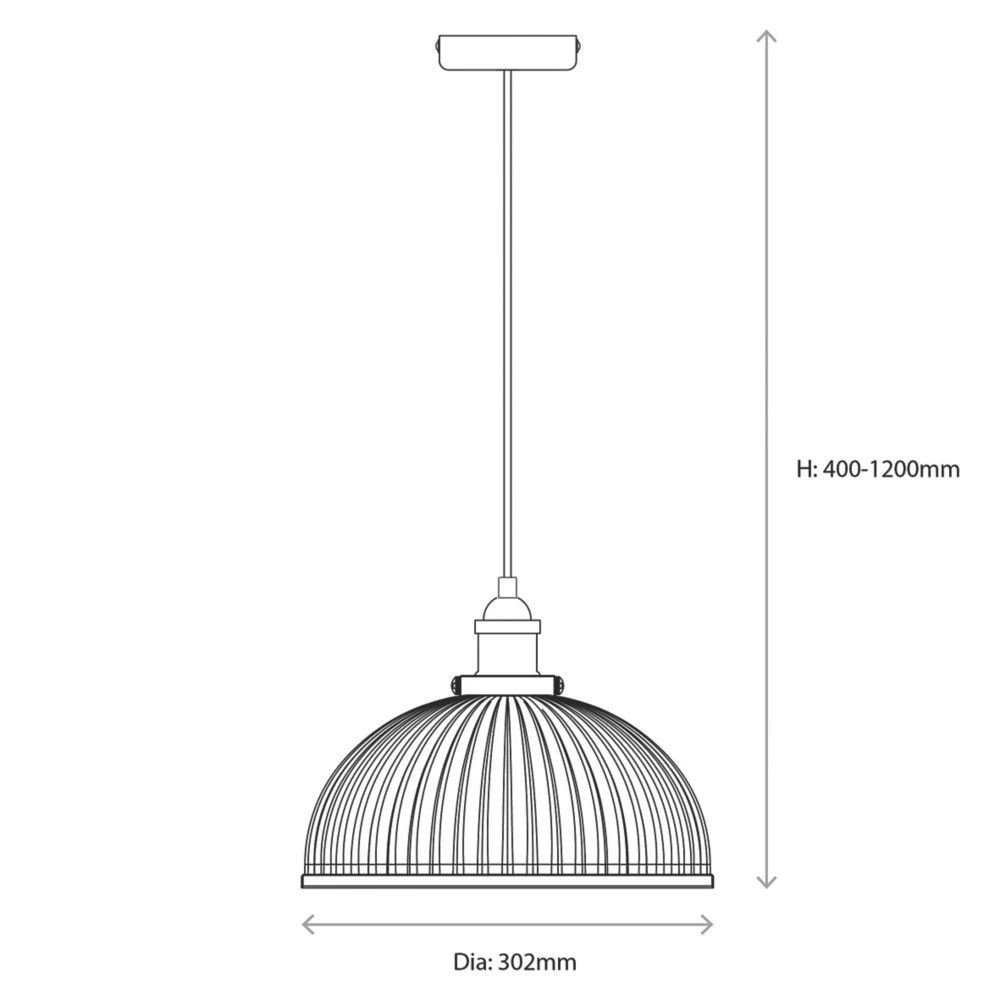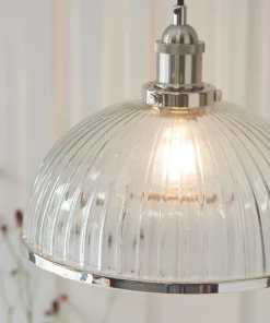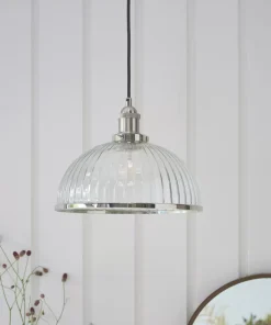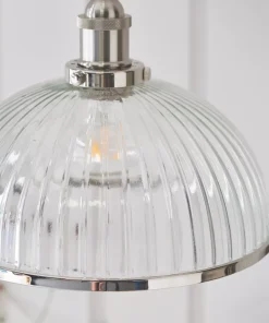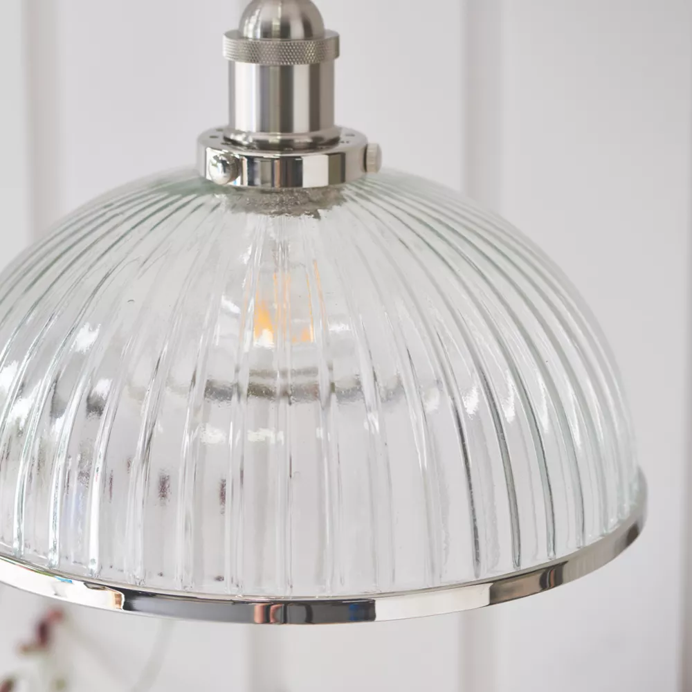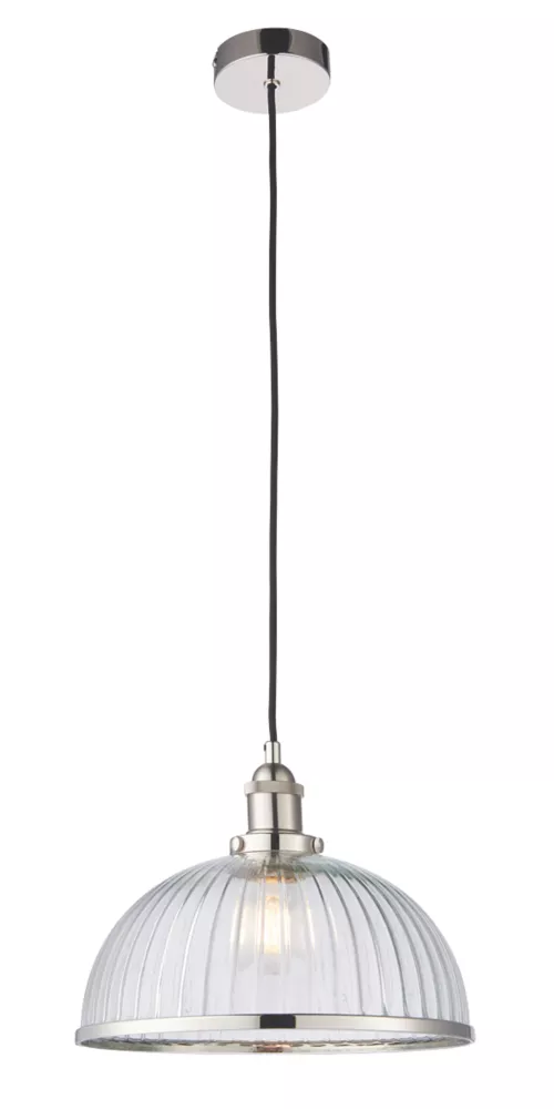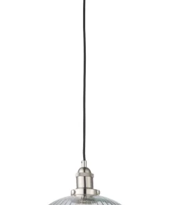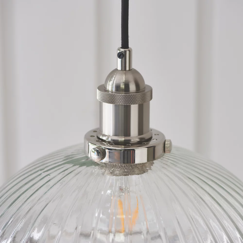 Industrial style. Clear glass shade with ribbed design, finished in bright nickel plate with knurled lamp holder detail. Suspended from height adjustable black fabric flex.