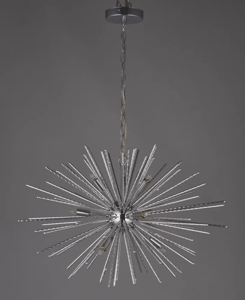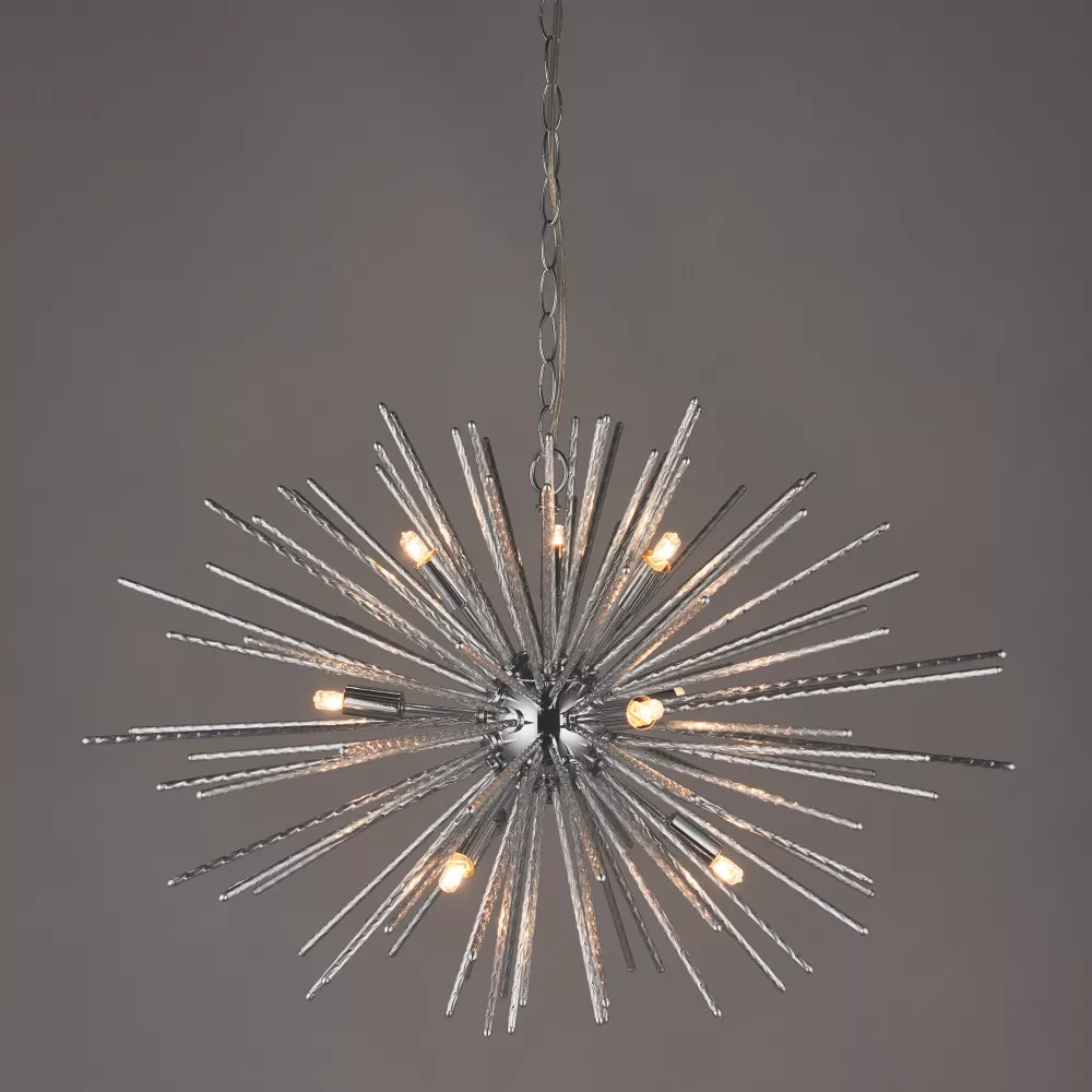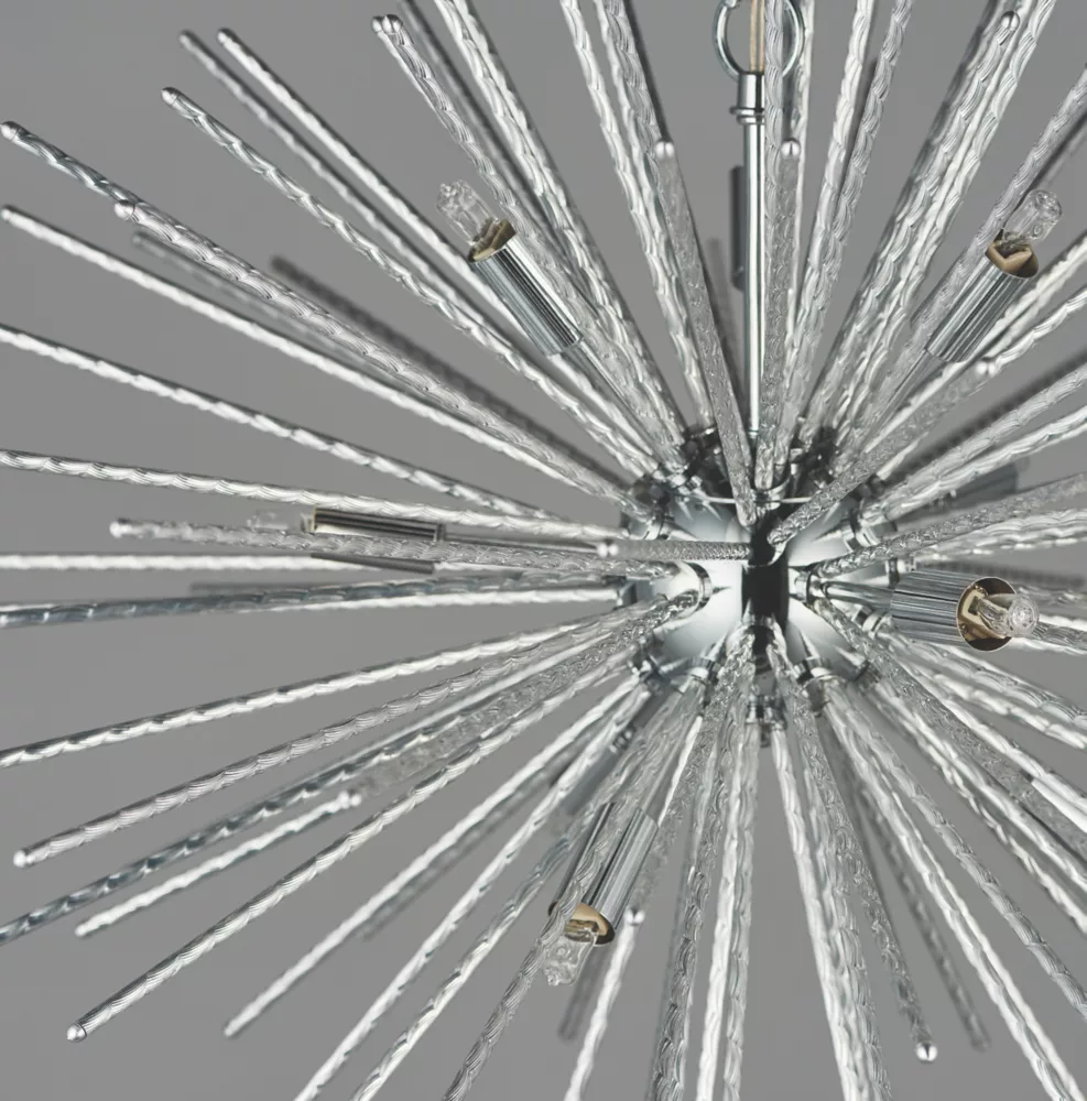 Suspended from height-adjustable chain with clear flex. 9 lights scattered among textured rods.