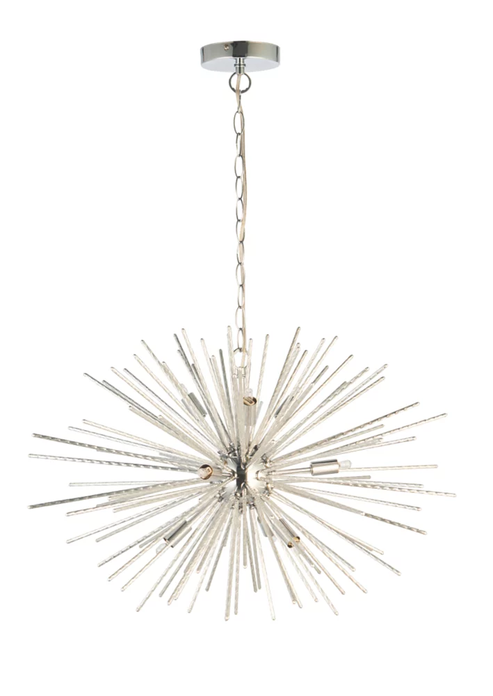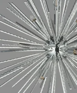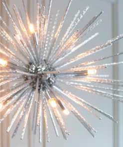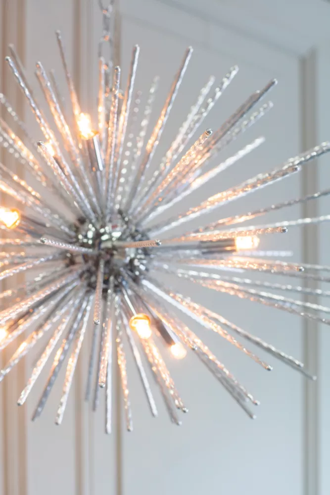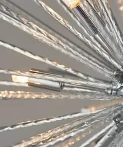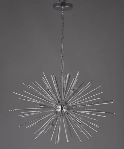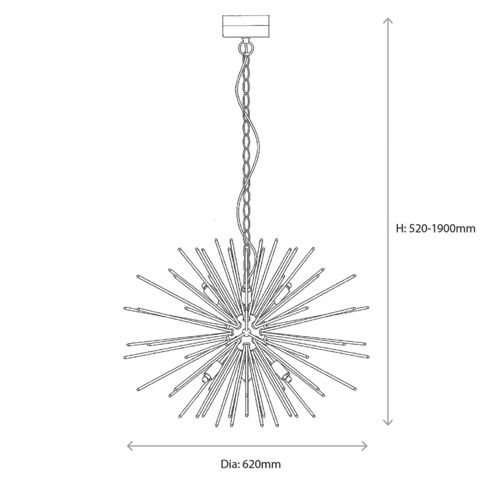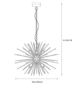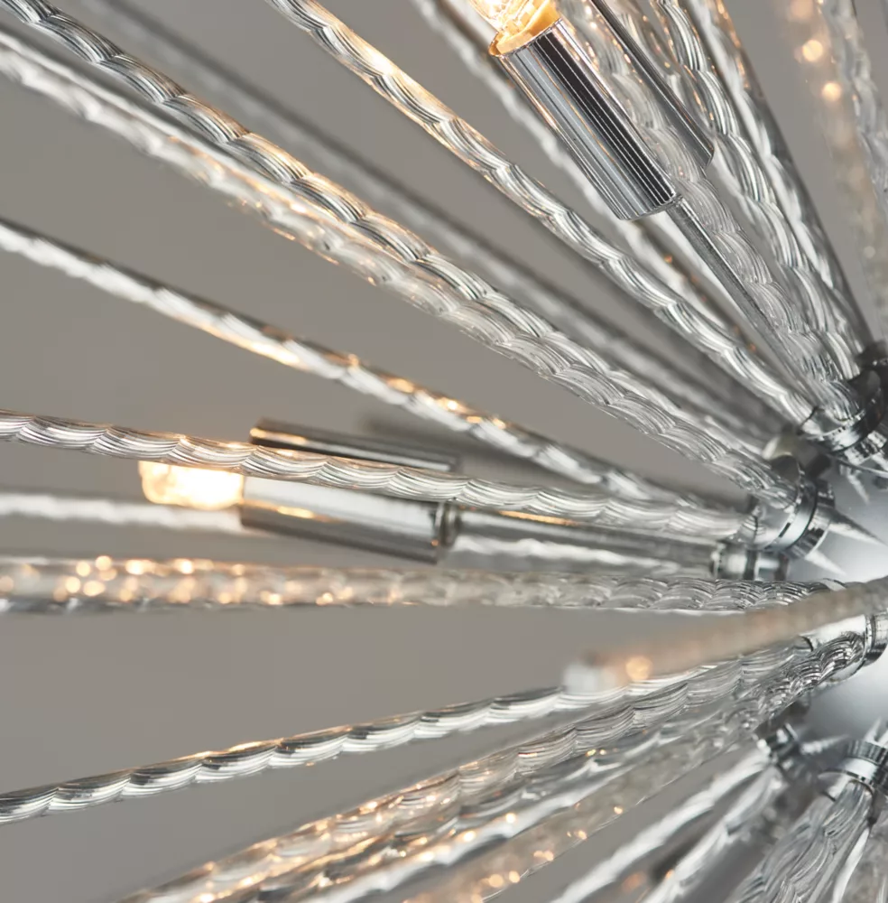 Suspended from height-adjustable chain with clear flex. 9 lights scattered among textured rods.