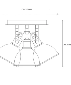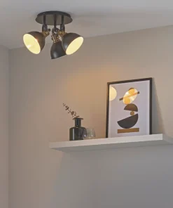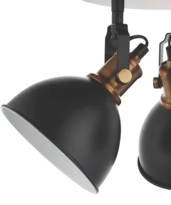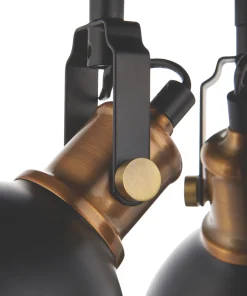 Industrial modern matt black and gold 3-light spotlight with adjustable heads. Metal shade provides directional task lighting. Compatible with LED lamps. Dimmable when fitted with dimmable bulbs.