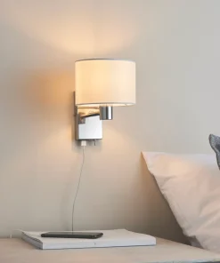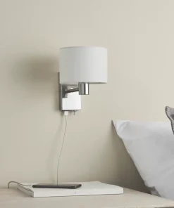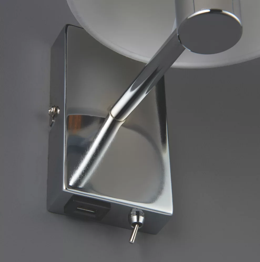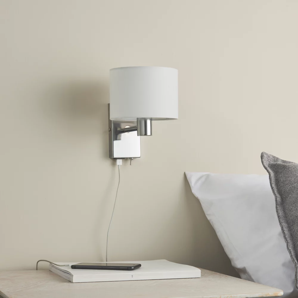 Stylish USB wall light with a natural linen shade. Suitable for a range of interiors. Features a toggle switch and an integrated USB driver.