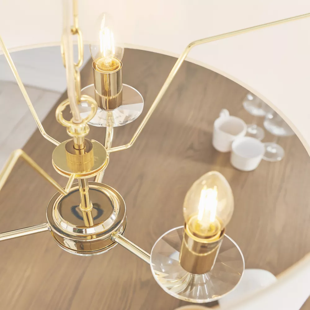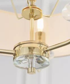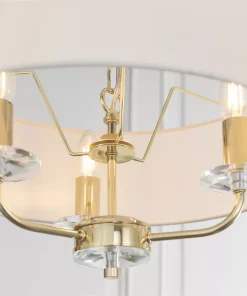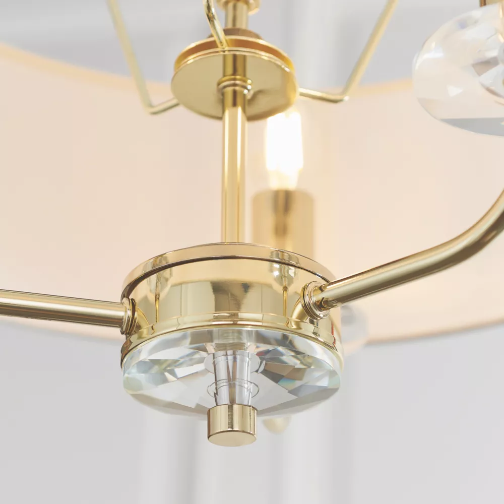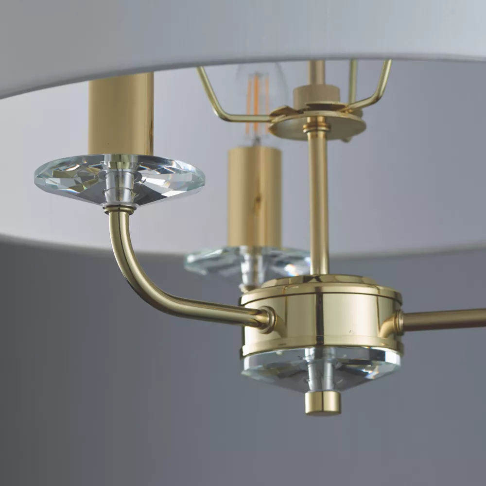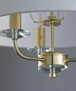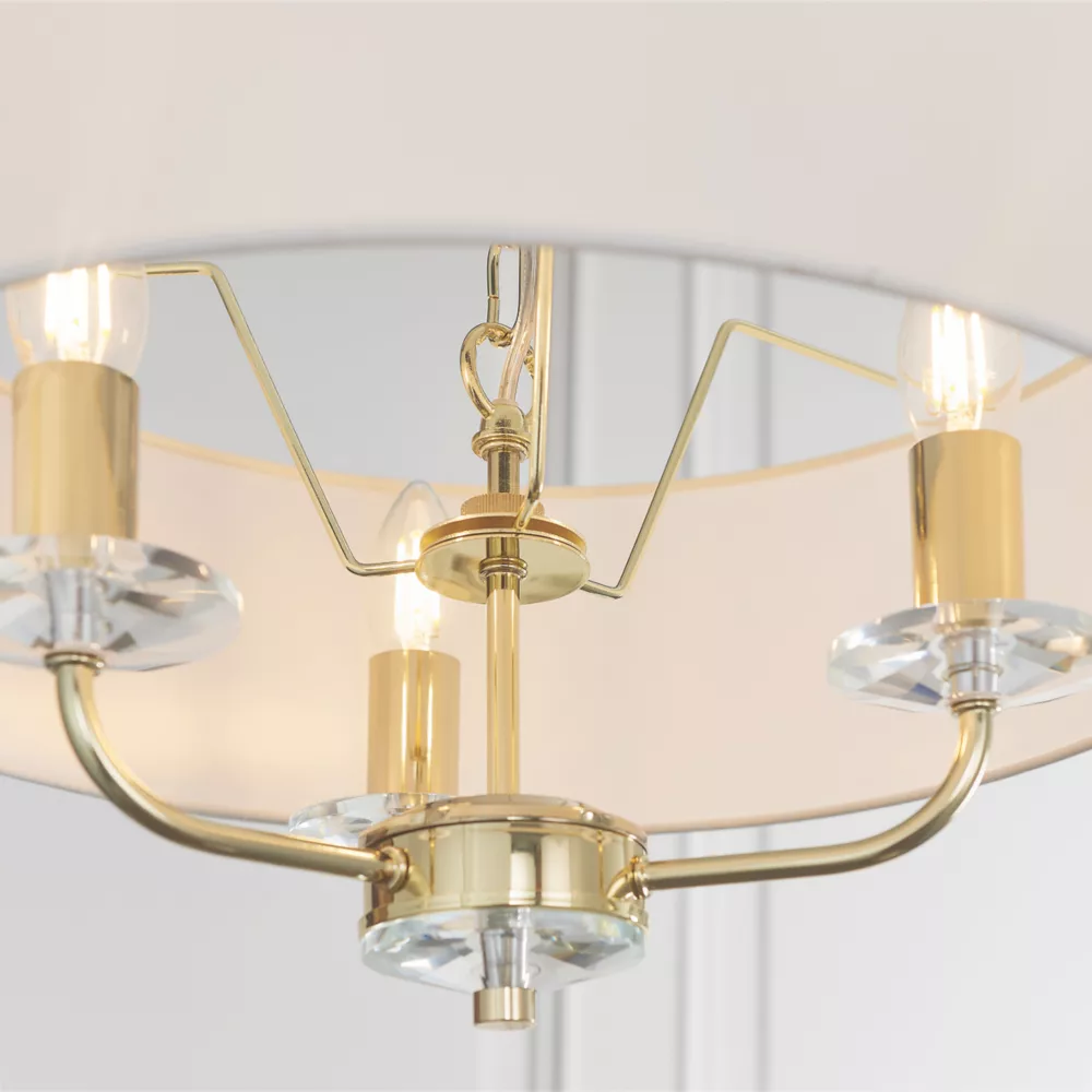 Brass-effect plated arms with crystal detailing. Fitting includes narrow, faux silk shade in vintage white colour.