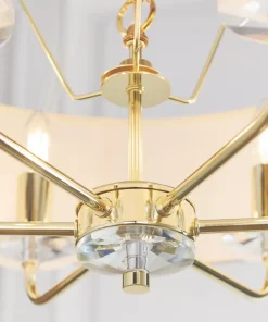 Brass-effect plated arms with crystal detailing. Fitting includes narrow, faux silk shade in vintage white colour.