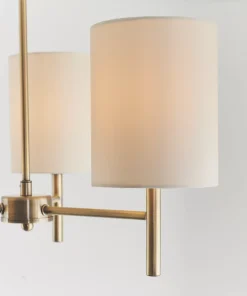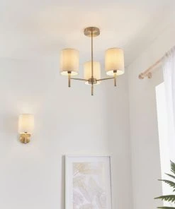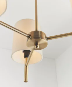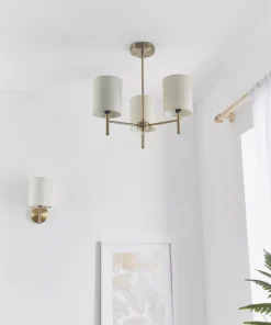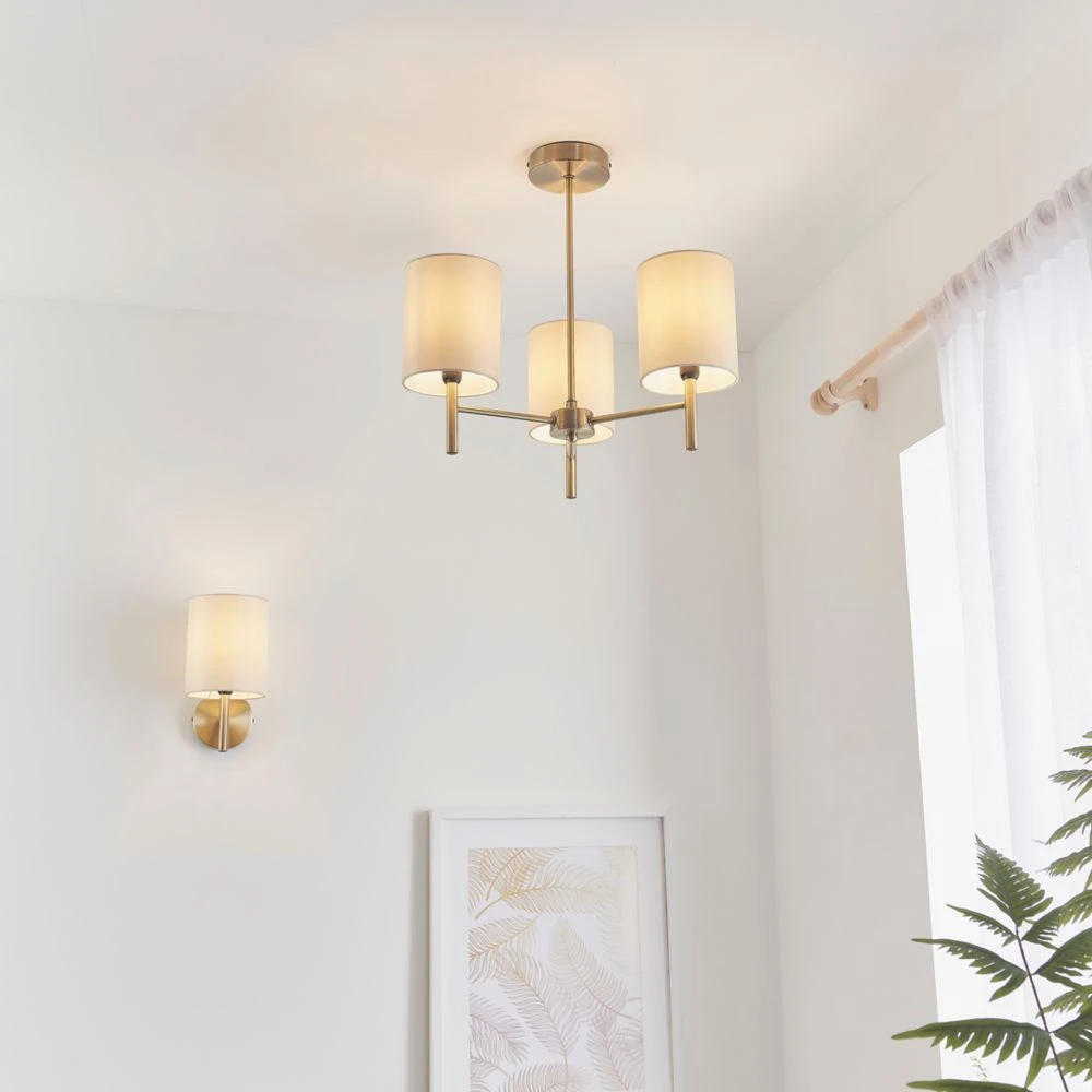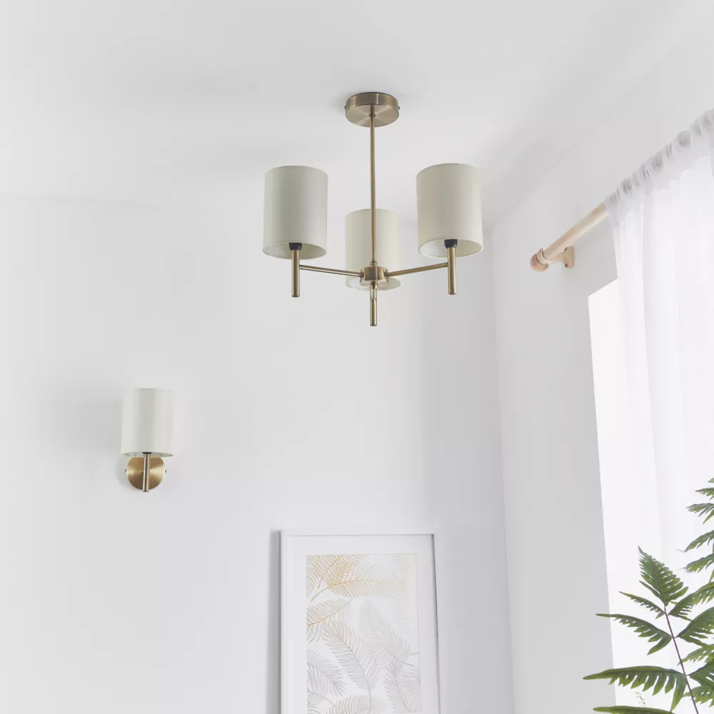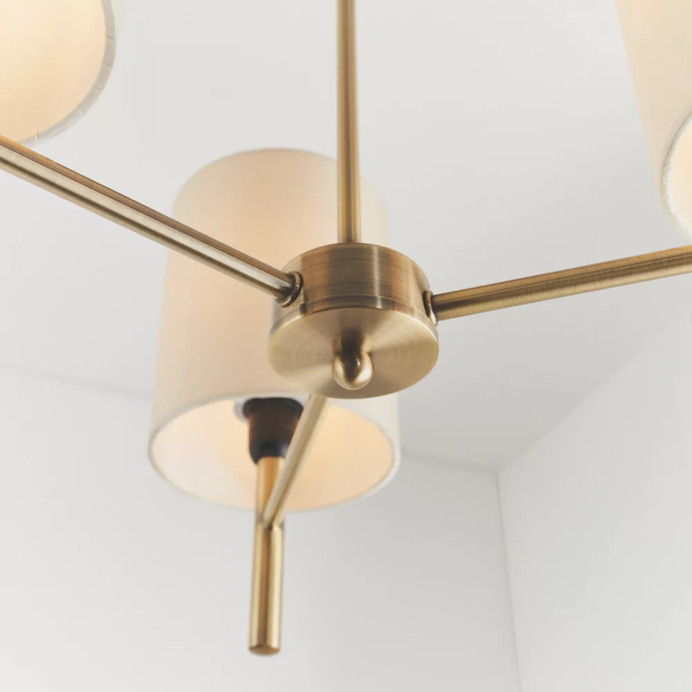 Antique brass finish with three cream fabric shades for a softer lighting effect.