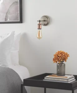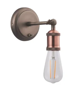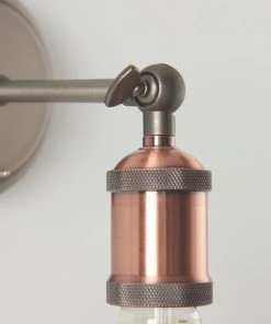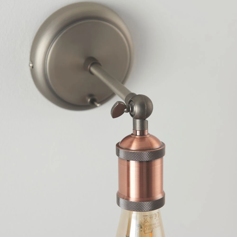 Industrial styled wall light, finished in aged pewter and aged copper. Adjustable knuckles and knurled lamp holders. Suitable for use with filament LED lamps and easily controlled by simple switch. Supplied with 1 x 2W warm white amber LED filament pear bulb.