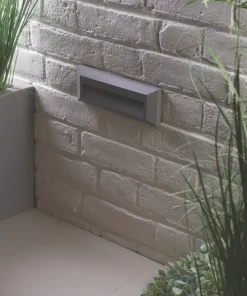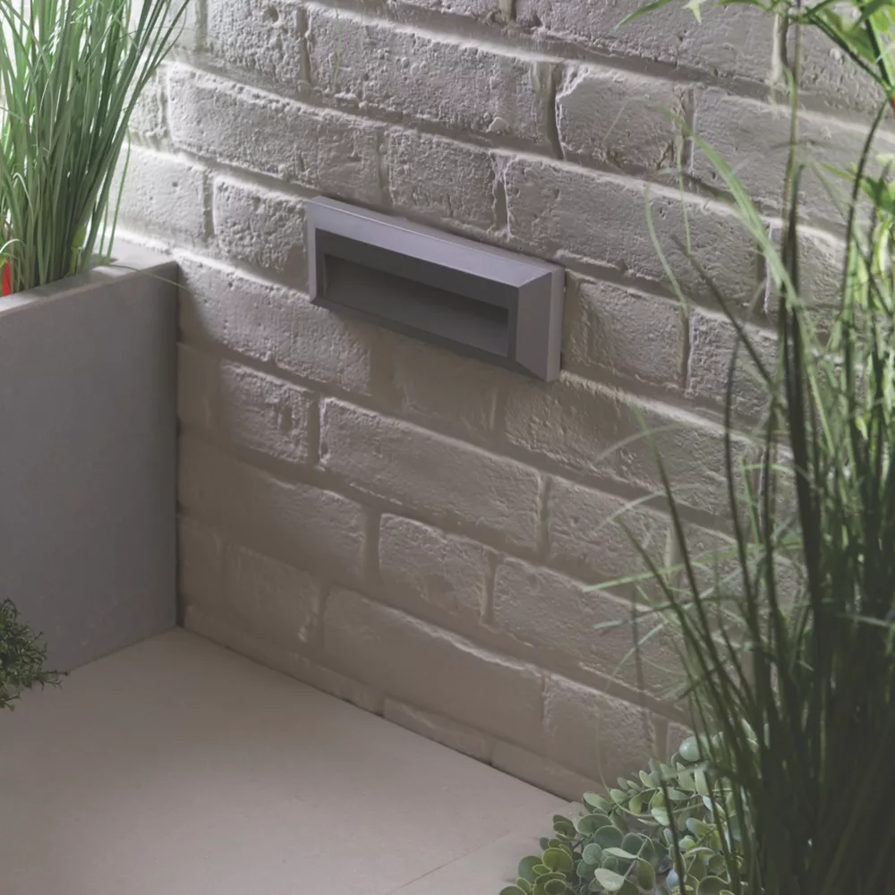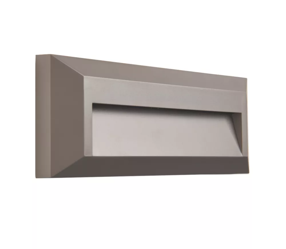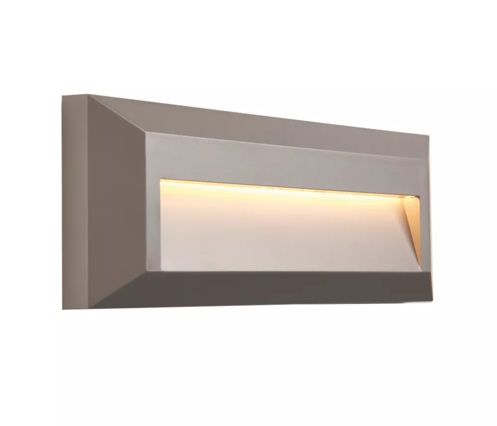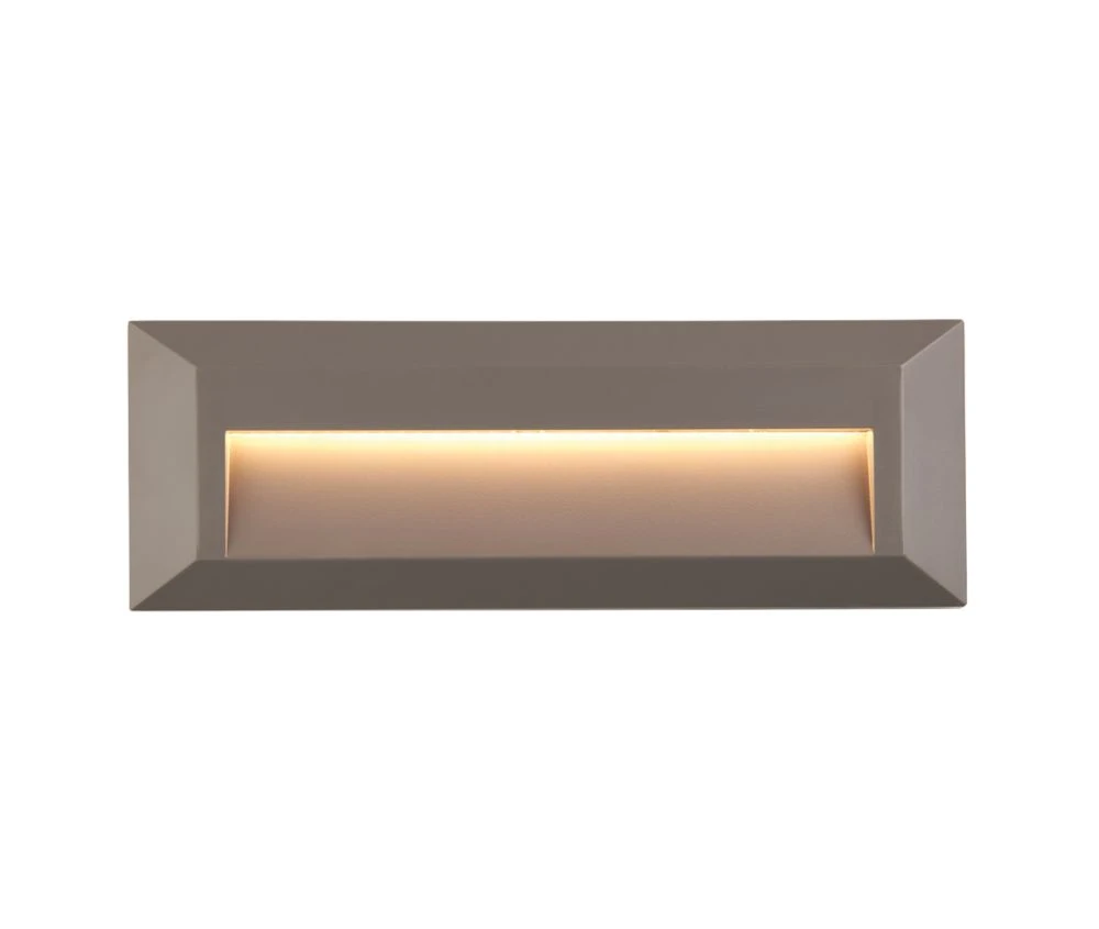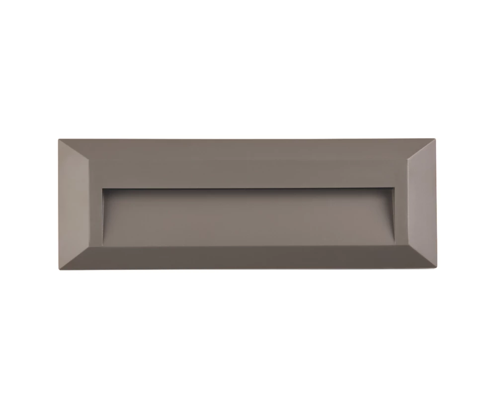 LED outdoor guide light constructed from plastic. Horizontal, rectangular wall downlight suitable for lighting pathways and driveways.